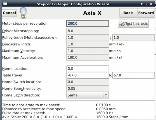 I then had to do a little bit of trial-and-error to arrive at the correct settings as I did not know the microstepping setting of my driver and it's mounted in such a way that you can't take the lid off to look at the switches.