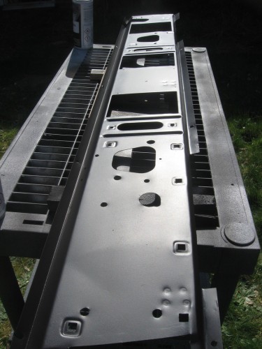 Now I've tracked down an actual dashboard, although I think the vent panel is Defender… much wire-brushing, drilling extra holes (for the rivnuts that hold the ECU to the binnacle) and then a coat of Corroless later: