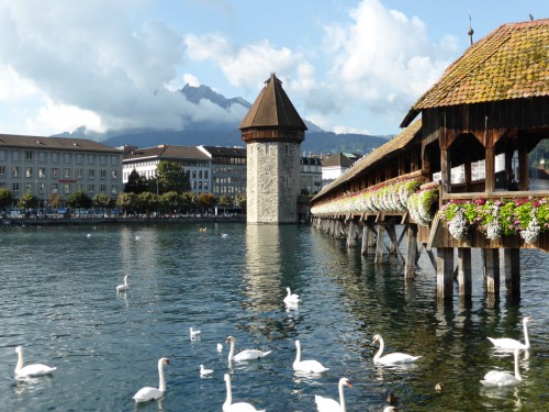 Lucerne is a very pretty town, with a very pretty historic (pretty and historic) bridge Kapellbrücke over the river Reuss. The bridge was under renovation when we visited so we were denied the thrill of a reciprocal ambulatory circuit, you could only walk as far the hallowed and ancient gift-shop tower half way along.