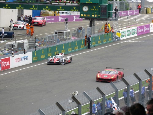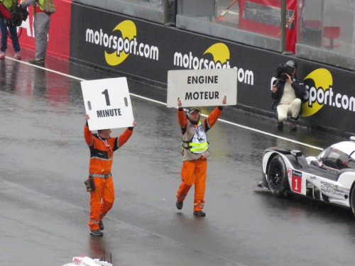 Then, as the chap with the chequered flag makes his way out, ready for the final lap, the Toyota grinds to a standstill on the finish line, with 3:25 remaining on the race clock: