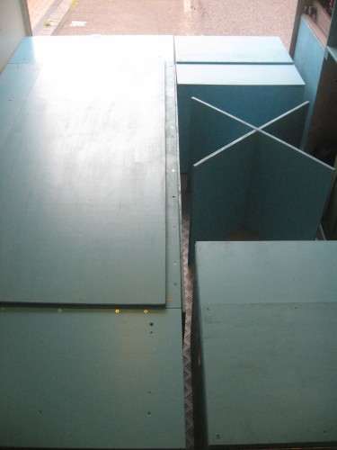 Slot two flat pieces together (they stow left of the fridge) to support the centre panel: