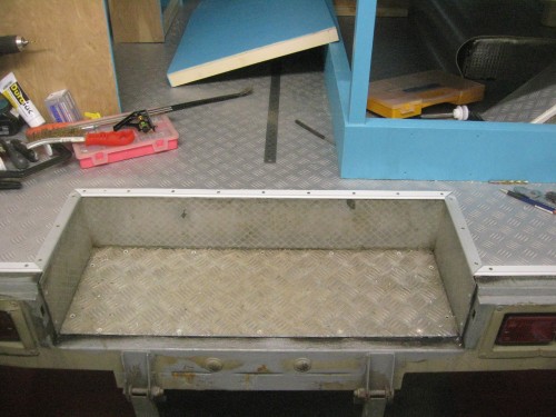 Keeping it simple, we found some chequer-plate effect lino from B&Q for the floor. When camping or at off-road events people are likely to get in & out with wet or muddy shoes, plus there's the bathroom area, which leaves not very much space for shag-pile carpet. The decision was just lino the whole floor and we could always throw a rug or something down to really tie the room together. One note on lino or maybe we should say “vinyl flooring” is that the modern soft stuff with a sort of foam backing is not as tough as old style hard lino. It's much nicer to walk on and presumably a little more insulating, but drop anything with a sharp corner on it and it WILL leave a hole.