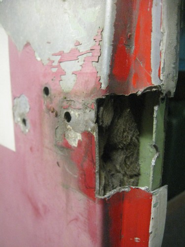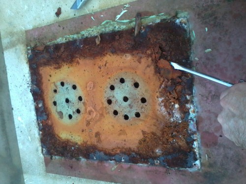 Roof vent was a steel cowling which was more than a little crusty, we were sure it was letting in water so I removed it, this was the rust left behind: