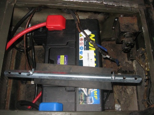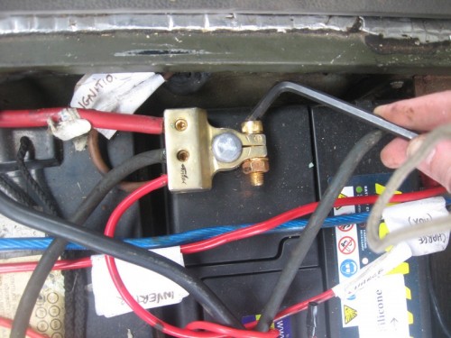 A single battery put back for now, with shiny new cables, a good earthing point, and quick-release terminals which have the handy benefit of having plastic tops. Factory split-charge wiring taped up for the time being.