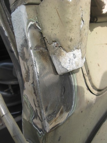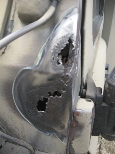 - Quite a few dents and scrapes but no show-stoppers. Big one in the back door apparently the work of a drunkard with a firework at a festival. It's only metal, it'll come out, we know a man with a TIG welder and a HobNob weakness