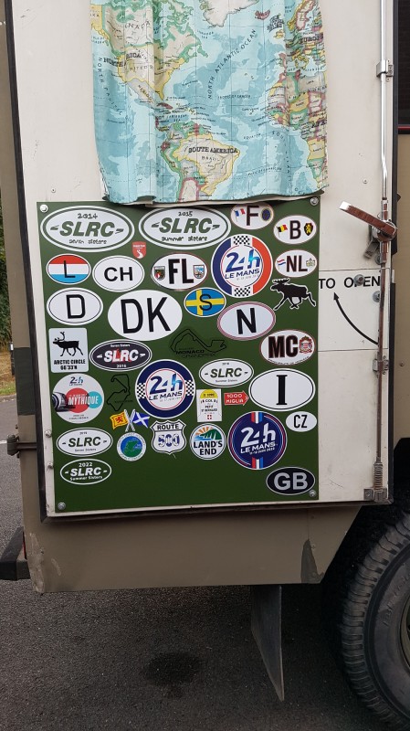 We like collecting stickers of places we've been but couldn't decide where to put them (outside would ruin the original look), and if we filled up a space you can't “save” stickers that are attached to a vehicle - so a replaceable sticker board was made for inside the rear door: