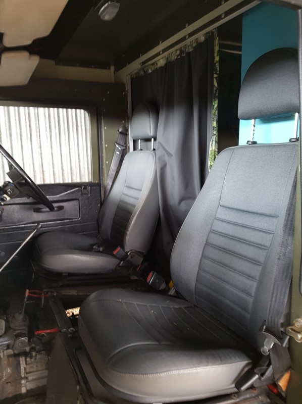 The squaddie-grade black vinyl jobs that came with were in good nick but not exactly the best on a sunny day, and the passenger didn't even get a head rest or the ability to adjust the seat! A used pair of Puma seats were sort-of affordable, bolted in, and were more supportive and adjustable than the rest.