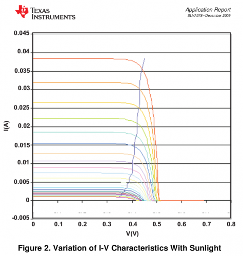 An MPPT charger basically constantly adjusts itself to find the sweet spot, the thin blue line on this graph of solar panel characteristics Vs sunlight: