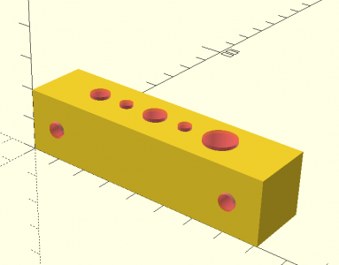 holes = [6,4,7,4,10]; // Holes to make, in mm, add/remove as required