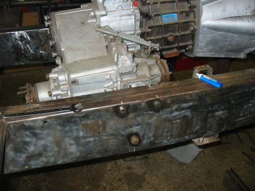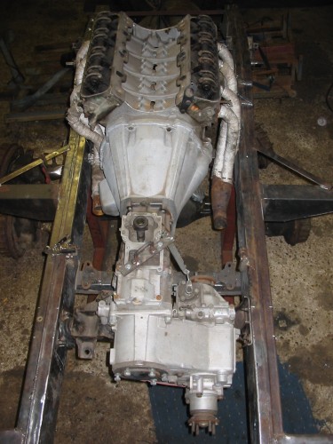 The sacrifical V8 is bolted to the gearbox & transfer box and offered up, measured up to compare prop lengths and positioning;