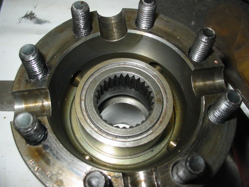This is the piece - it locks the centre diff spider to the rear output shaft. There's a sleeved bearing which supports the front shaft and stops it rattling about in the case. I dare say if you were feeling bold you could weld the spider/rear section solid and turn up a phosphor-bronze bushing for the front shaft and call it done… but the kit was ~£150 and we know it works.