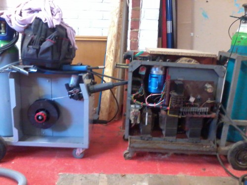 Here it is facing off against a modern MTA unit (which is still a decent welder) - you can see how huge the wire feed motor is in comparison: